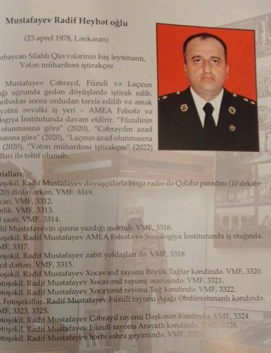 Kataloqda AMEA Fəlsəfə və Sosiologiya İnstitutunun Azərbaycasn Silahlı Qüvvələrinin baş leytenantı Vətən Müharibəsi iştirakçı, fəlsəfə üzrə fəlsəfə doktoru, dosent Radif Mustafayev haqqında məlumatlar yerləşdirilib. Radif Mustafayev Cəbrayıl, Füzuli, Laçın uğrunda gedən döyüşlərdə iştirak edib. “Füzulinin, Cəbrayılın, (2020), Laçının, (2020) azad olunmasına görə “Vətən Müharibəsi iştirakçısı” medalları ilə təltif olunub.